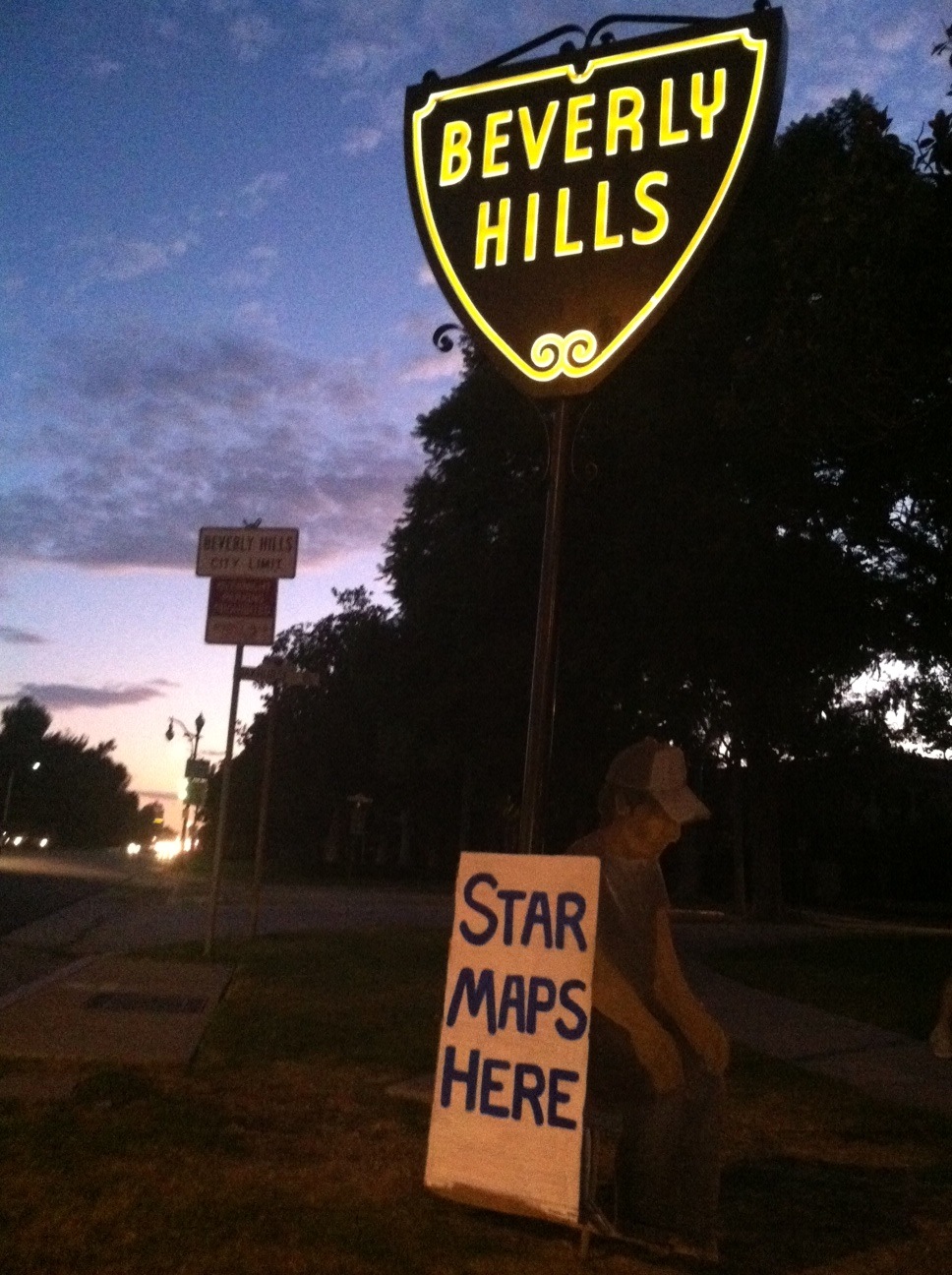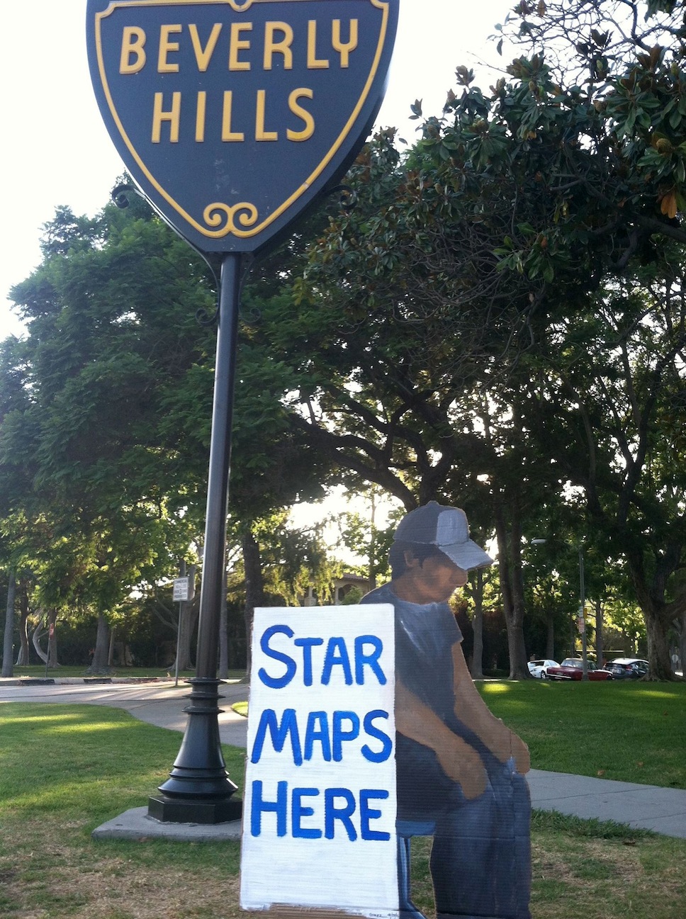 Here, in the artist’s photographs, is the life story of Ramiro’s newest creation, the guy who sells tourists Maps to the Stars Homes. Ramiro says his name is Antonio. He works his trade at the eastern edge of Beverly Hills, at Santa Monica Boulevard and Doheny, on the border with West Hollywood. Will he be there Thursday morning?