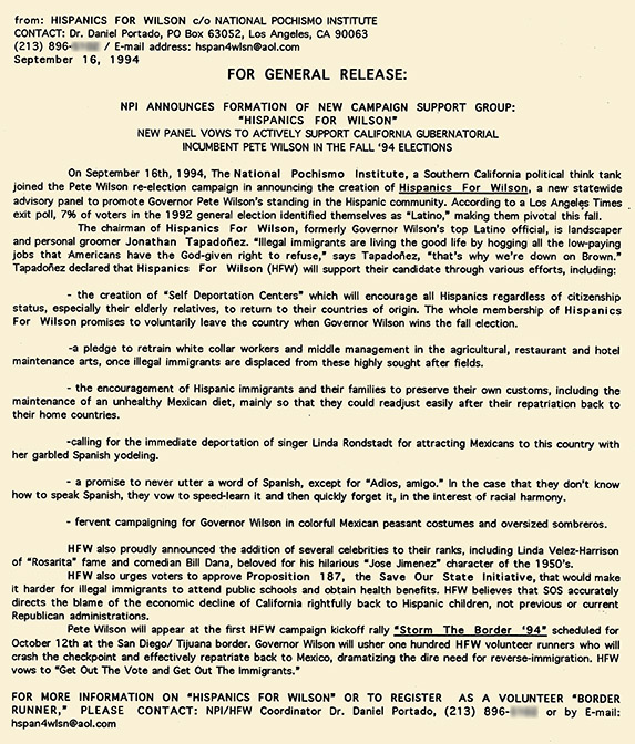 This is the first-ever recorded instance of “Self-Deportation,” an original Hispanics For Wilson press release dating from Mexican Independence Day, 1994. Daniel D. Portado was then known as “Dr. D. Portado.”