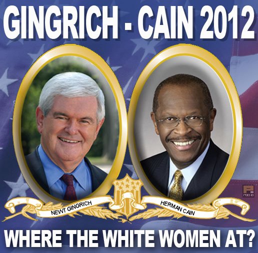 (PNS reporting from LA FLORIDA) In an apparent play for the VP nod, former gangster pizza mogul and serial groper Herman Cain has endorsed former Freaker of the Spouse Newt Gingrich in his bid for the Republican presidential nomination. Enthusiastic Cain aides leaked this prototype of their dream ticket campaign poster.